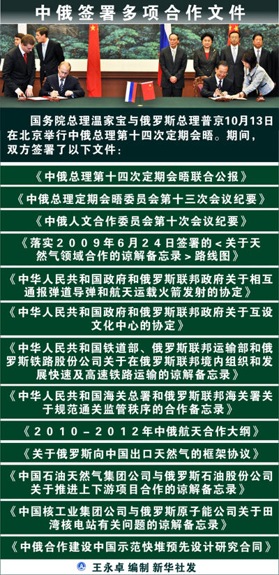 新华网北京10月13日电(记者廖雷、姬少亭)国务院总理温家宝与俄罗斯总理普京13日在北京举行中俄总理第十四次定期会晤。期间,双方签署了以下文件:
