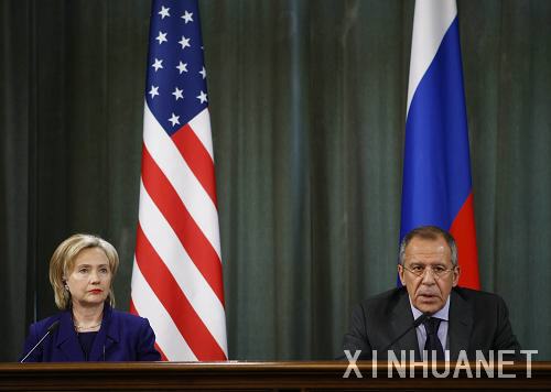 10月13日,俄罗斯外交部长拉夫罗夫(右)与美国国务卿希拉里在莫斯科俄外交部小别墅就反导、朝核等议题举行会谈后共同出席新闻发布会。会谈双方当天宣布,俄美就起草削减核武器新条约的磋商已取得“重要进展”。 新华社记者鲁金博摄