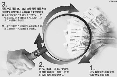 公安部恢复设立反假币处,成立全国公安机关打击假币犯罪“09行动”决战前线指挥部,拿出1000万元用于大要案经费补助及表彰奖励,组织派驻督导组深入各地明察暗访,广东、浙江、河南、安徽等省份组建打击假币犯罪专业队伍……眼下,公安部门打击假币犯罪一系列举措相继出台。10月10日全国公安机关打击假币犯罪“09行动”决战电视电话会议召开,公安部副部长刘金国号召,全国公安机关和广大民警,决战40天,夺取打击假币犯罪“09行动”的决定性胜利。