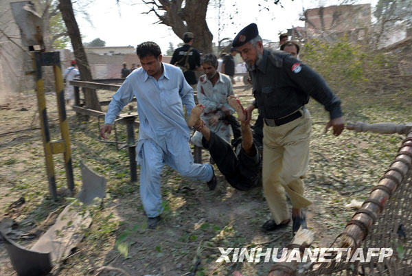 10月16日,在巴基斯坦白沙瓦市,一名警察和路人搬运受伤者。巴基斯坦西北边境省首府白沙瓦市一所警察局附近16日发生汽车炸弹袭击,造成至少12人死亡、16人受伤。新华社/法新