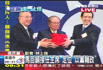 马英九从吴伯雄手中接过党主席印信。(台湾TVBS图)