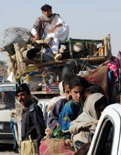 从17日开始,在空中力量的掩护下,巴基斯坦地面部队开始对南瓦齐里斯坦的塔利班大本营展开清剿行动。与此同时,超过十万的民众已经逃离南瓦济里斯坦的部落地区。救援机构预计,随着军事攻势的升级,将会有更多人流离失所。图为10月18日,巴基斯坦民众正在逃离南瓦济里斯坦地区。