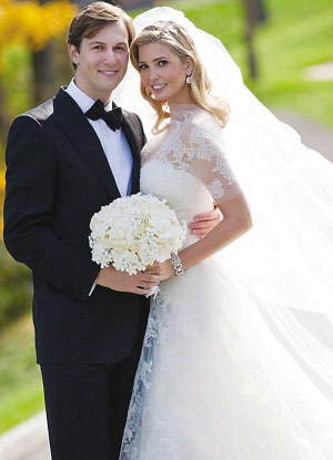据扬子晚报消息,据英美媒体近日报道,10月25日,纽约地产大亨唐纳德·特朗普的掌上明珠——27岁的伊万卡与大她一岁的名门公子喜结连理,两人在美国新泽西州的特朗普国家高尔夫球俱乐部举行了盛大婚礼,在500名嘉宾的见证下步入婚姻殿堂。伊万卡的丈夫杰瑞德是美国新泽西州地产大亨查理斯·库斯纳的儿子,这对“美国地产界王子公主”的结合,无疑为两个家族建立了比合并更牢固的“强强联合”关系。