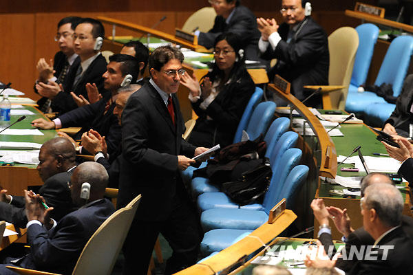 10月28日,在美国纽约联合国总部,参加联大会议的代表在古巴外长罗德里格斯(站立者)发言后鼓掌。当日,第64届联合国大会以压倒性多数通过决议,敦促美国结束对古巴的封锁。这是联大连续第18年通过此类决议。新华社记者申宏摄