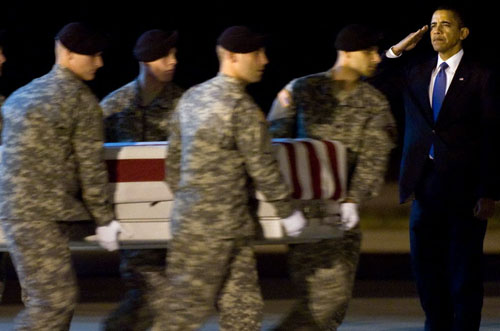 美国总统奥巴马深夜抵达空军机场,向在阿富汗阵亡的美国公民致敬。