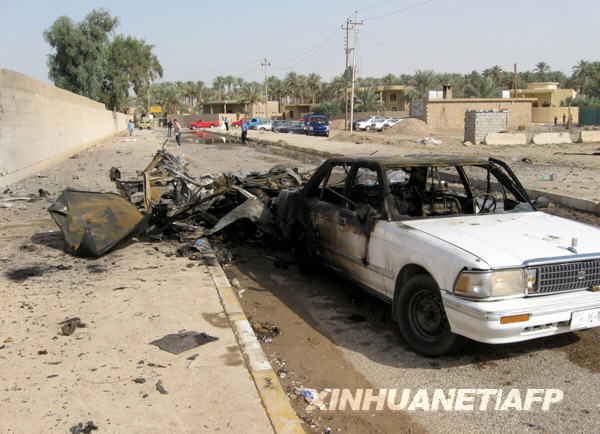 11月1日,在伊拉克西部城市拉马迪,汽车残骸散落在街上。当天,拉马迪发生两起炸弹袭击事件,造成两人死亡。新华社/法新
