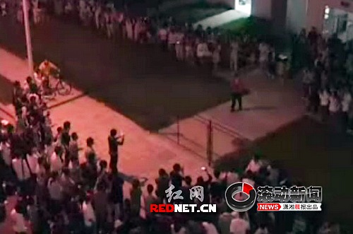 视频画面中,一群学生模样的年轻人正在一个男青年的带领下,沿着校园的水泥路面涌向一栋宿舍楼前,这名男青年情绪似乎很是激动,手上拿着一张纸,双手作喇叭形状对着女生宿舍楼上拼命地大喊“我爱你,……我就按照我们的约定开始吧,所有楼上楼下的弟兄们,跟着我一起喊,XXX,你是个禽兽!预祝我成功吧”,还有人在旁边喊让大家安静一下,女生宿舍的很多楼层的电灯都亮着,不少女生都站在走廊或是窗前观望。