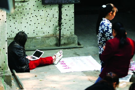 11月9日,渝中区两路口,一收废品的女子坐在地摊边用笔记本电脑上网 记者 龙在全 摄