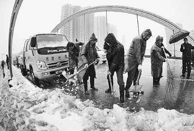 11月17日,安徽省芜湖市的市政抢修人员在清理道路积雪。陈立希摄