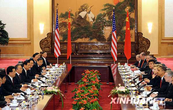11月17日上午,中国国家主席胡锦涛在北京人民大会堂东大厅与美国总统奥巴马举行正式会谈。新华社记者 黄敬文 摄