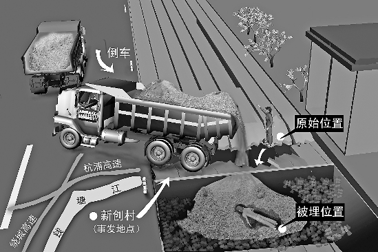 老婆站在预制板上指挥,徐才将车缓缓开上了预制板。忽然只听见“轰”的一声,车子侧翻了。“出事了”,徐才赶紧跳下车,跑到车后一看:老婆不见了!随着被车压成数截的预制板一起坠了下去。车内十几吨的泥沙、砖块全部倾倒了下去。老婆被埋在了里面,只露出头发。