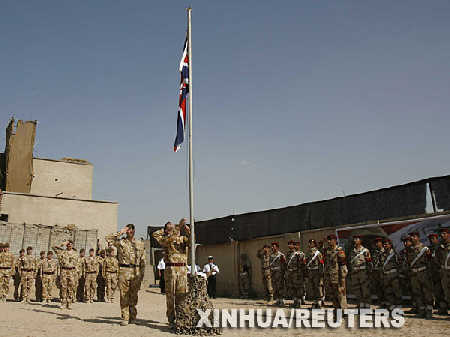 资料图片:英国士兵在伊拉克南部城市巴士拉举行的军营移交仪式上降下英国国旗。