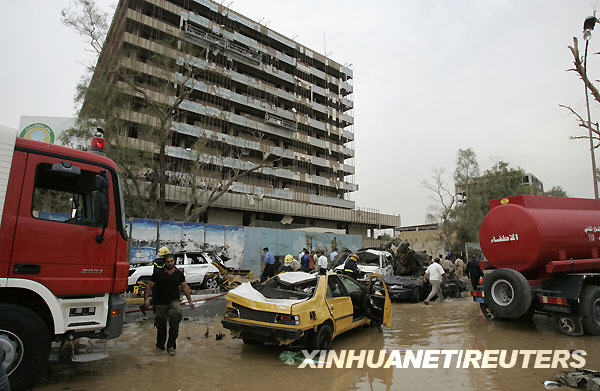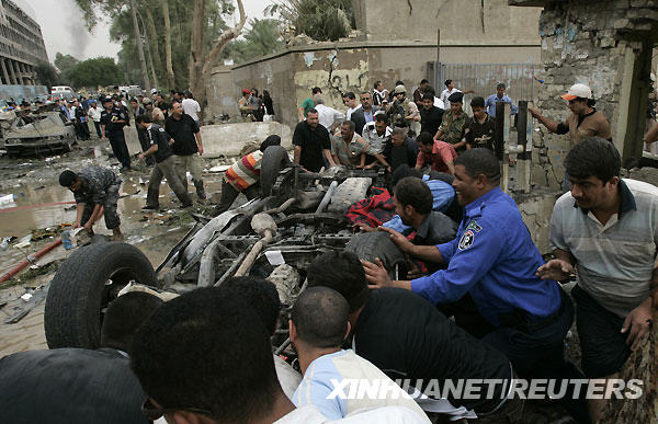 10月25日,在伊拉克首都巴格达,人们清理爆炸现场,抢救伤员。当天,巴格达市中心发生两起汽车炸弹袭击,死亡人数不断攀升。新华社/路透
