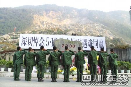 守望北川的武警战士在“5·12”纪念碑前敬最后一个军礼
