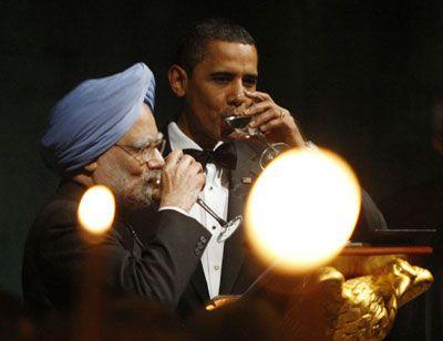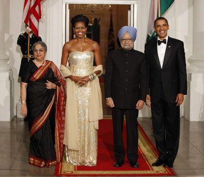 中国日报网环球在线消息:美国总统奥巴马和夫人米歇尔11月24日晚在白宫南草坪设盛大国宴,宴请正在华盛顿访问的印度总理辛格夫妇。这是奥巴马就任总统以来首次以国宴规格接待外国领导人,媒体分析认为这是奥巴马想借此表达美国对印度这个南亚伙伴的重视。国宴的菜单、装饰、宾客、娱乐节目等多方面都能体现出主人有意促进两国友谊的匠心。