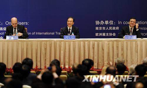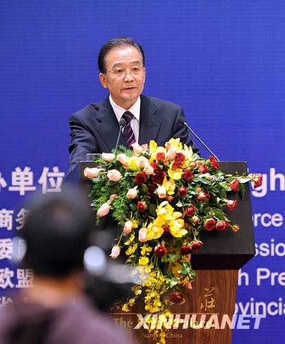 11月30日,国务院总理温家宝在江苏南京与欧盟领导人共同出席第五届中欧工商峰会闭幕式并发表演讲。新华社记者韩瑜庆摄