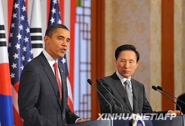 资料图片:11月19日,在位于韩国首都首尔的总统府青瓦台,美国总统奥巴马(左)在记者招待会上发言。正在韩国访问的奥巴马当日在首尔宣布,美国朝鲜政策特别代表博斯沃思将于12月8日访问朝鲜。新华社/法新