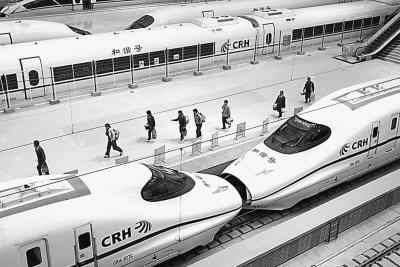 9日中午,参加武广专线试车的重联列车停在武汉火车站内。金思柳摄(人民图片)