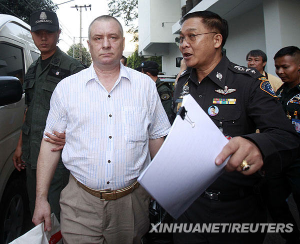 12月14日,在泰国曼谷,一名被截获载有军火的运输机的机组人员被警察带离法院。4名哈萨克斯坦人和1名白俄罗斯人乘俄制伊尔-76大型运输机于12日以加油为名降落在泰国首都曼谷廊曼机场。运输机上装载大约35吨武器。泰国警方13日指控载有军火的运输机上5名机组人员涉嫌非法持有武器,但这几人在接受警方问询时称对所载货物系军火毫不知情。新华社/路透