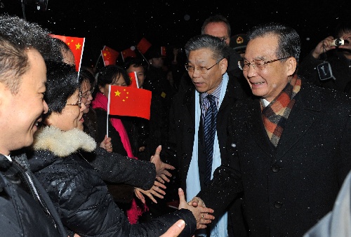 温家宝在机场受到当地华侨华人和留学生代表的热烈欢迎。新华社记者武巍摄