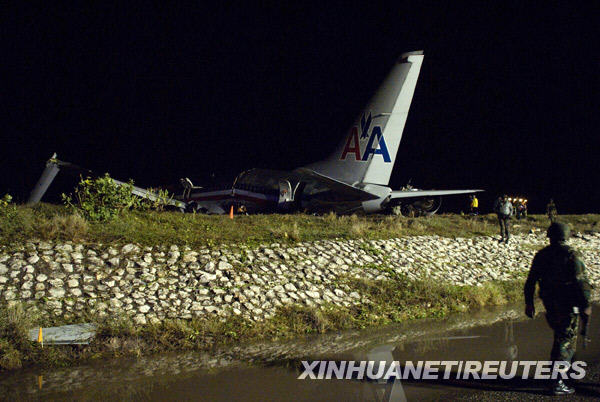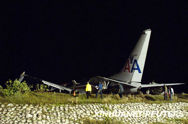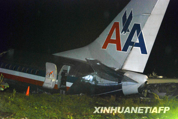 这是2009年12月22日在牙买加金斯敦国际机场拍摄的飞机事故现场。这架美国航空公司的波音737客机当晚在牙买加金斯敦国际机场降落时冲出跑道,造成40名乘客受伤,其中3人伤势严重。新华社/法新