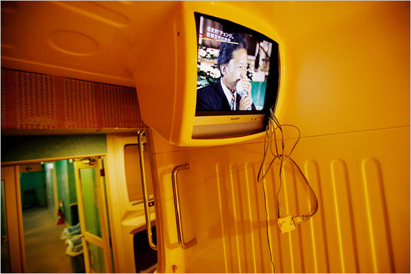 《纽约时报》记者田渊弘子(音译)日前来到中西淳入住的“胶囊旅社新宿510”采访。放眼望去,旅社楼道两旁是两排整整齐齐的格子间,好似火车卧铺。格子铺共分上下两层,每个格子间深不过2米,宽和高不过1.5米。