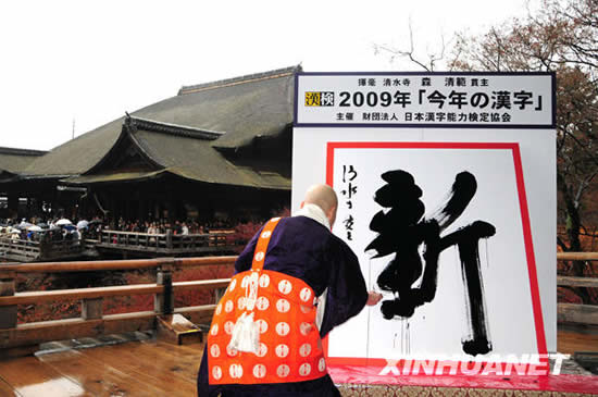 2009年,京都清水寺住持森清范照例用其特大毛笔,在1.5 米长 1.3米宽的纸面上龙飞凤舞,一气呵成所写就一个汉字“新”,本年得票率最高的汉字。响应号召,参与“年度汉字”活动的人已增加到16余万,其中8.7%选择“新”,其次为“药”,第三则是“政”字。这些字如实反映了日本人的全年感受,就是新政权已经出现,虽然带来新希望、新气象,但社会还在沉沦,原本形象清新又活泼的女艺人酒井法子,竟然也嗑药被捕了。
