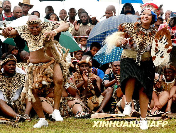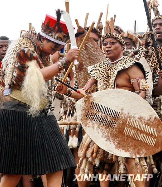 当天,年近古稀的南非总统祖马举行祖鲁传统婚礼,迎娶比自己年轻三十岁的第三名夫人。祖马此前共结婚四次,其中一名妻子离婚,一名自杀,托贝卡·马迪巴成为其第三名现任夫人。新华社/法新