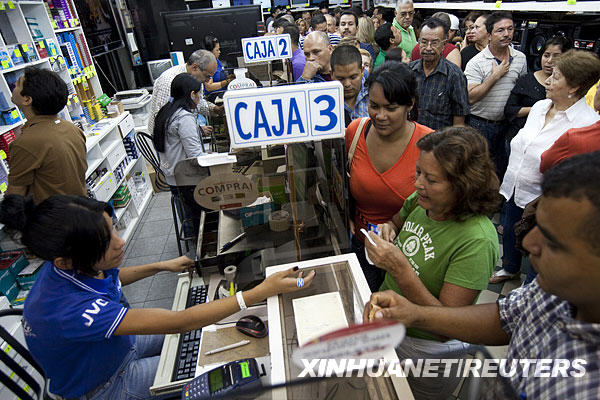 1月9日,在委内瑞拉首都加拉加斯的一个家用电器店,大批顾客在收款台前等候。当日,由于担心货币贬值导致进口商品物价上涨,当地大批居民来到家用电器商店抢购商品。委内瑞拉总统乌戈·查韦斯8日晚宣布,委内瑞拉货币玻利瓦尔对美元汇率从11日起贬值,同时施行“石油美元”与“重要进口产品”双轨制汇率:对于食品、医疗用品等关乎民生和经济生产的“重要进口产品”,汇率将从1美元兑换2.15玻利瓦尔变为1美元兑2.6玻利瓦尔;对于汽车、电信产品、家用电器等适用于“石油美元”的进口产品,汇率则将变为1美元兑4.3玻利瓦尔。新华社/路透