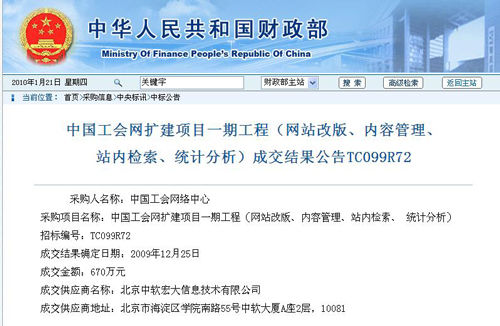中国工会网扩建项目一期工程(网站改版、内容管理、站内检索、统计分析)成交结果公告TC099R72
