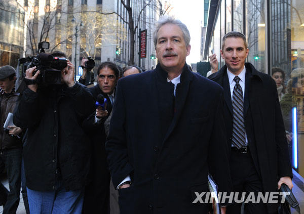 1月16日,在美国纽约欧盟常驻联合国代表团驻地外,美国负责政治事务的副国务卿威廉·伯恩斯 (右二)在会谈结束后离开。来自美国、俄罗斯、中国、英国、法国和德国等6国的外交官当天在美国纽约就伊朗核问题开始举行会谈。 新华社记者申宏摄