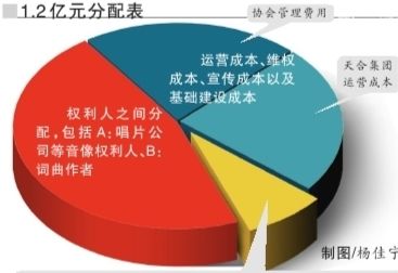 核心提示:音集协3年收取卡拉OK版权费1.7亿元。分配方案为:23%为音集协管理费用,27%归收费单位(天合公司),剩下50%在权利人之间进行分配,歌曲的点唱率、点唱次数、唱片公司拥有的版权数额等,为分配依据。