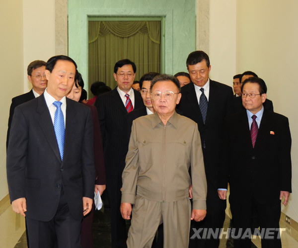 2月8日,朝鲜劳动党总书记、国防委员会委员长金正日(前中)在咸镜南道咸兴市会见了正在朝鲜进行友好访问的中共中央对外联络部部长王家瑞(前左)一行。新华社发