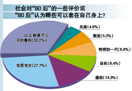 时至今日,“另类”早已不足以概括中国的“80后”。本报调查发现,对于社会舆论贴在自己身上的“宅男宅女”、“脆弱”、“自私”、“垮掉的一代”、“叛逆”等标签,大部分受访者并不十分认同。33.2%的受访者认为这是社会加诸于“80后”身上的不公正的标签。