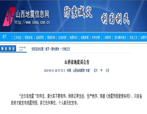 记者注意到,阳泉地震局网站转发的山西省地震局紧急公告发布时间为21日早上6:20:45,全文如下:“近日有地震”的传言,请大家不要信传。保持正常生活、生产秩序。根据《地震预报管理条例》,只有省政府才能发布地震预报,其它任何单位、个人都无权发布。