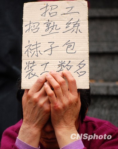 2010年2月24日,近期,沿海各地相继出现“用工荒”,在浙江省义乌市劳务市场外,上千企业的招工者举着自制的纸板“招工”牌寻求工人,但一些招工单位前基本处于无人问津的状态,许多招工者忍不住困意,竟在招工现场睡着了。中新社发许康平摄