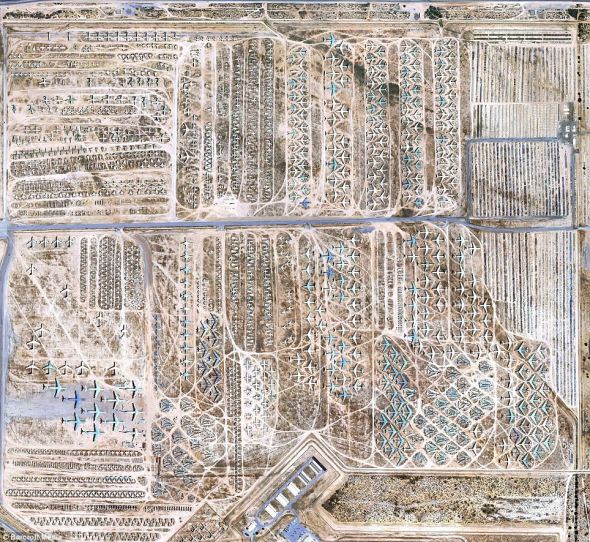 “谷歌地球”图片显示,B—52型轰炸机、F—14型战斗机、A—10型攻击机这些曾经的空中霸主如今像秦始皇兵马俑一般陈列在美国西南部亚利桑那州沙漠的“墓地”中。
