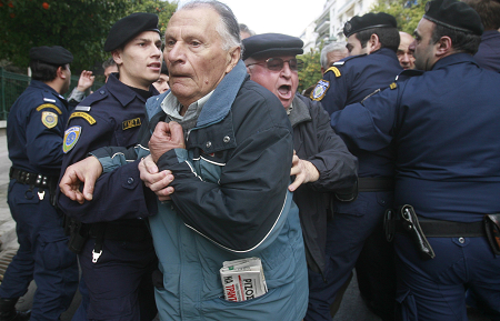 图为当地时间3日,希腊居民在抗议政府的新财政紧缩方案
