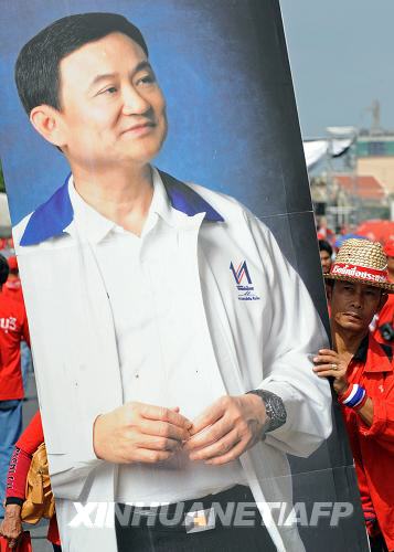 3月14日,在泰国首都曼谷,反政府组织“红衫军”成员集会时手举泰国前总理他信的肖像。“红衫军”当天中午时分发出最后通牒,要求阿披实领导的泰国政府在24小时内解散国会下议院。 新华社/法新