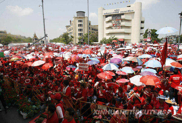 3月14日,在泰国首都曼谷,支持泰国前总理他信的反政府组织“红衫军”成员参加集会。“红衫军”当天中午时分发出最后通牒,要求阿披实领导的泰国政府在24小时内解散国会下议院。 新华社/路透