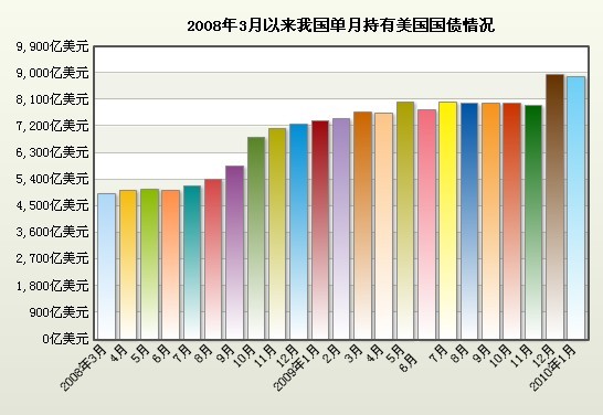 新华网华盛顿3月15日电 (记者 刘洪 刘丽娜) 美国财政部15日公布的数据显示,今年1月份,中国持有美国国债8890亿美元,比上月减少58亿美元,中国仍是美国最大债权国。