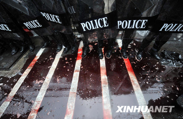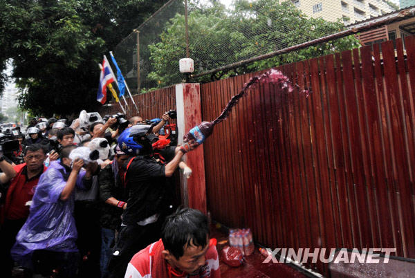 3月17日,泰国“红衫军”在总理阿披实位于曼谷的住宅前泼洒血液。新华社记者吕小炜摄