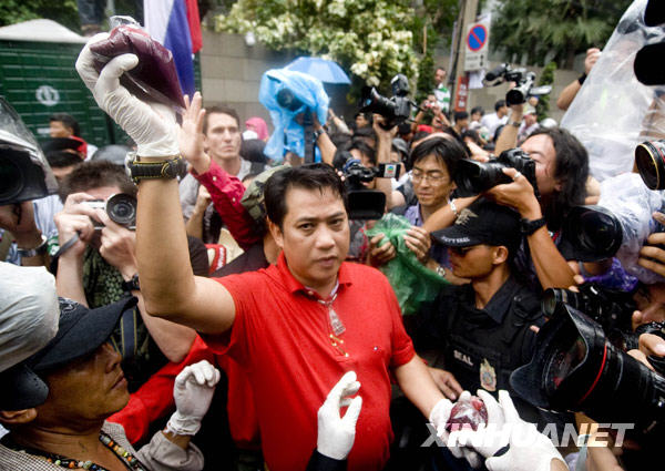 泰国“红衫军”17日把前一天收集的血液泼向总理寓所,继续向现任总理阿披实·维乍集瓦施压。