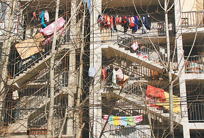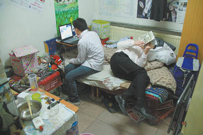 作为低成本的居住方式,“群居”在蚁族中颇为普遍,对于某些“蚁族”来说,“群居”是他们最熟悉和乐意选择的一种生活方式。 王学敬,研究生,现任上地某科技公司技术支持工程师,月收入四五千元,这在唐家岭绝对算是“高收入”了,但他依然和几个同事挤在房顶上加盖的小“阁楼”里,不足20平方米的房间放着两个上下铺床,4个人一起分担每月600元的房租。“不光是为了省钱,更重要的是我们大学的时候就是同学,现在又很幸运在一起工作,我们愿意继续像大学时那样过集体生活。” 林伟莉,本科毕业后的两年里一直和别人合租,合租的女孩儿换了一拨又一拨,但她从没想过搬出去自己住:“从小过集体生活习惯了,现在特怕一个人住,太孤独,而且女孩儿自己住有时也不安全。”