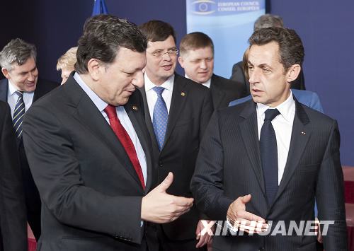 3月25日,在比利时首都布鲁塞尔,欧盟委员会主席巴罗佐(左)与法国总统萨科齐在欧盟峰会合影后交谈。希腊政府发言人乔治·佩塔洛蒂斯25日证实,在当天晚间召开的欧元区峰会上,欧元区成员国领导人通过了希腊救助方案,方案完全满足了希腊的要求,因此希腊接受。新华社报道员莫纳斯摄