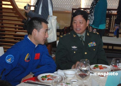 资料图:驻澳门部队司令员王玉仁与航天英雄翟志刚交谈。 中新社发 毕永光 摄