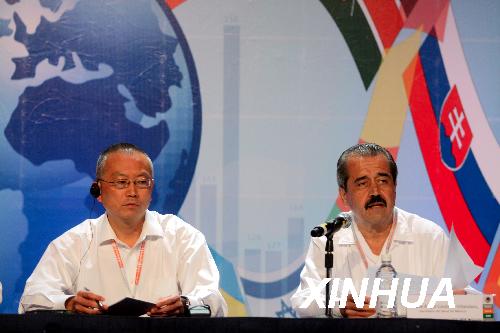 2009年7月3日,世界卫生组织助理总干事福田敬二(左)和墨西哥卫生部长科尔多瓦出席在墨西哥坎昆举行的世界卫生部长会议闭幕式。新华社发(伊丽莎白·路易斯摄)