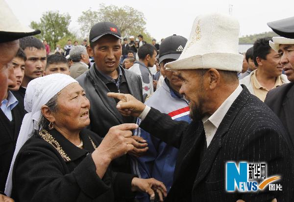 4月14日,在吉尔吉斯斯坦南部城市贾拉拉巴德,吉总统巴基耶夫的支持者(左)阻止反对派“临时政府”的支持者前往参加集会。 新华社/路透