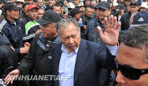 4月13日,吉尔吉斯斯坦总统巴基耶夫(中)在吉南部贾拉拉巴德州首府贾拉拉巴德市举行的集会现场向支持者挥手。巴基耶夫呼吁其支持者保持镇静,不要尝试占领州政府。 新华社/法新