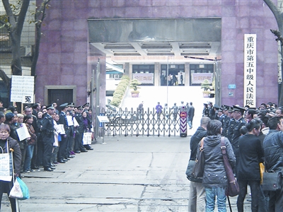 14日,重庆市第五中级人民法院门口。该院对文强及其手下“三大金刚”黄代强、赵利明、陈涛涉黑案宣判。